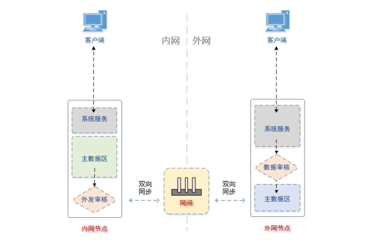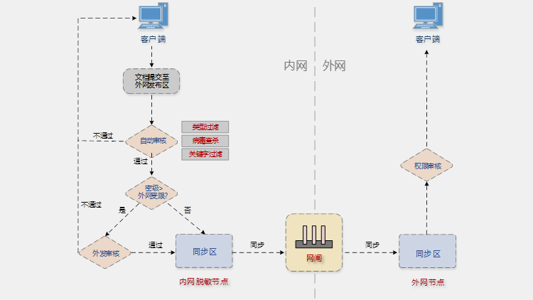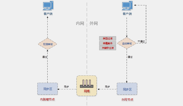 内外网文件交换方案由内网文档云、双向网闸以及外网文档云三部分组成。内外网文档云上的文件,须经过预定的安全审核流程后,方可通过双向网闸将数据摆渡(同步)到另一侧,以确保数据的安全。